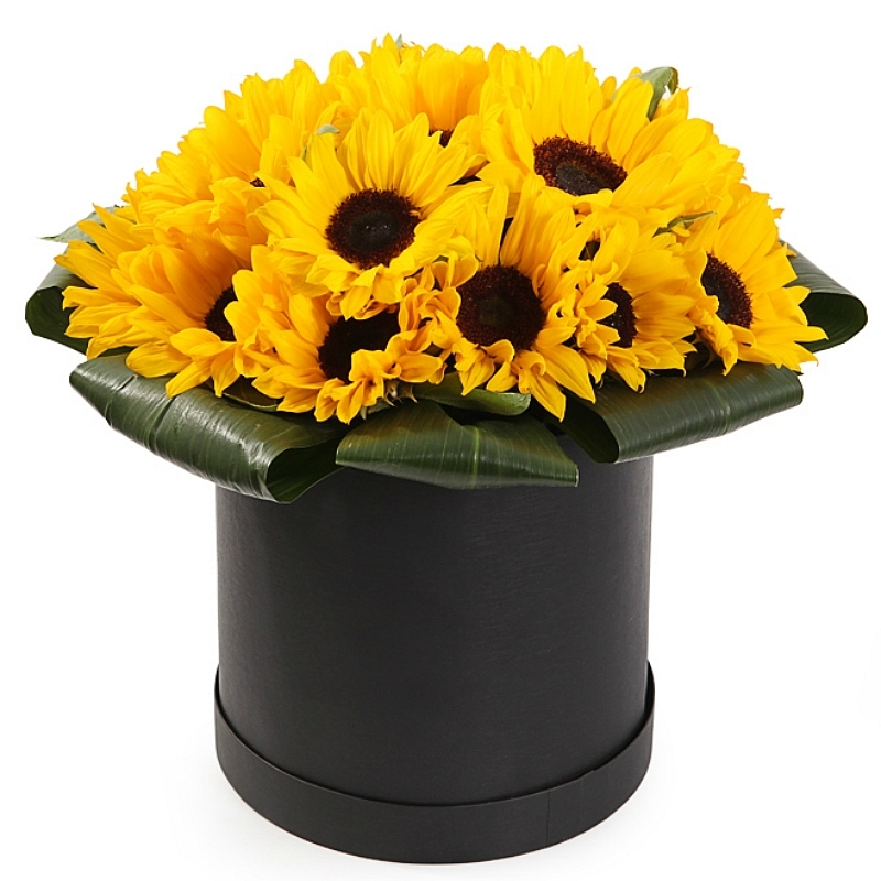 Букет состоит из 15 подсолнухов, аспидистра, коробка, оазис.