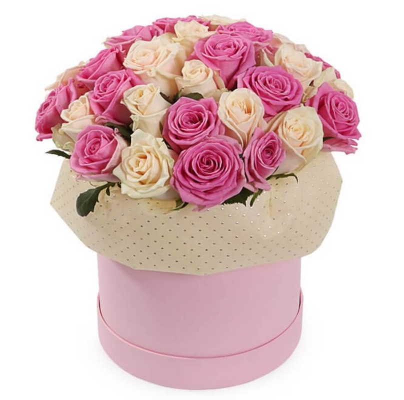 Букет состоит из 35 розовых и кремовых роз, коробка.