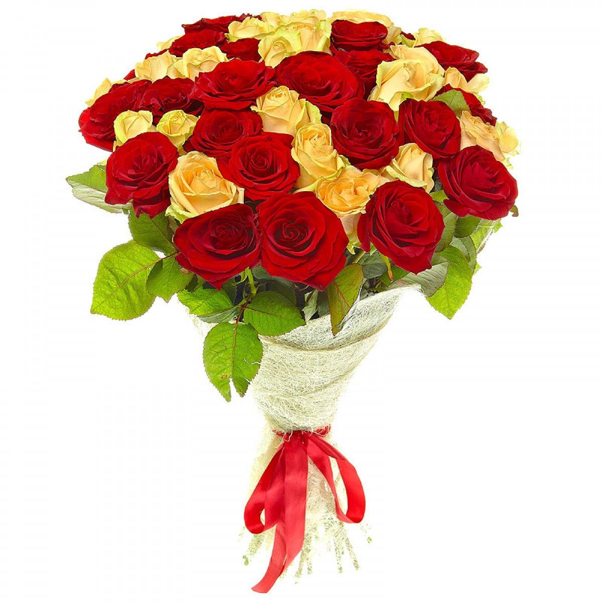Букет состоит из 26 красных роз, 25 желтых роз, зелень, красивая упаковка.