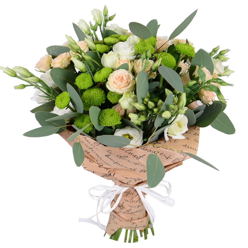 Букет состоит из 5 кустовых роз, 5 эустом, 3 ветки хризантемы, эвкалипт, крафт, атласная лента.