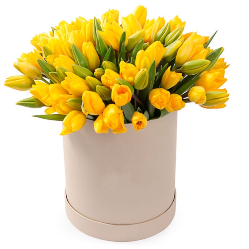 Букет состоит из 75 желтых тюльпанов, коробка, оазис.